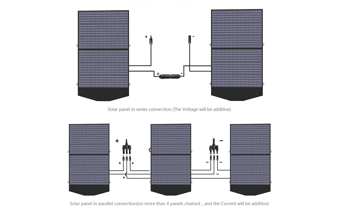 Door meerdere zonnepanelen parallel of in serie aan te sluiten, kun je hoger vermogen en spanning krijgen.