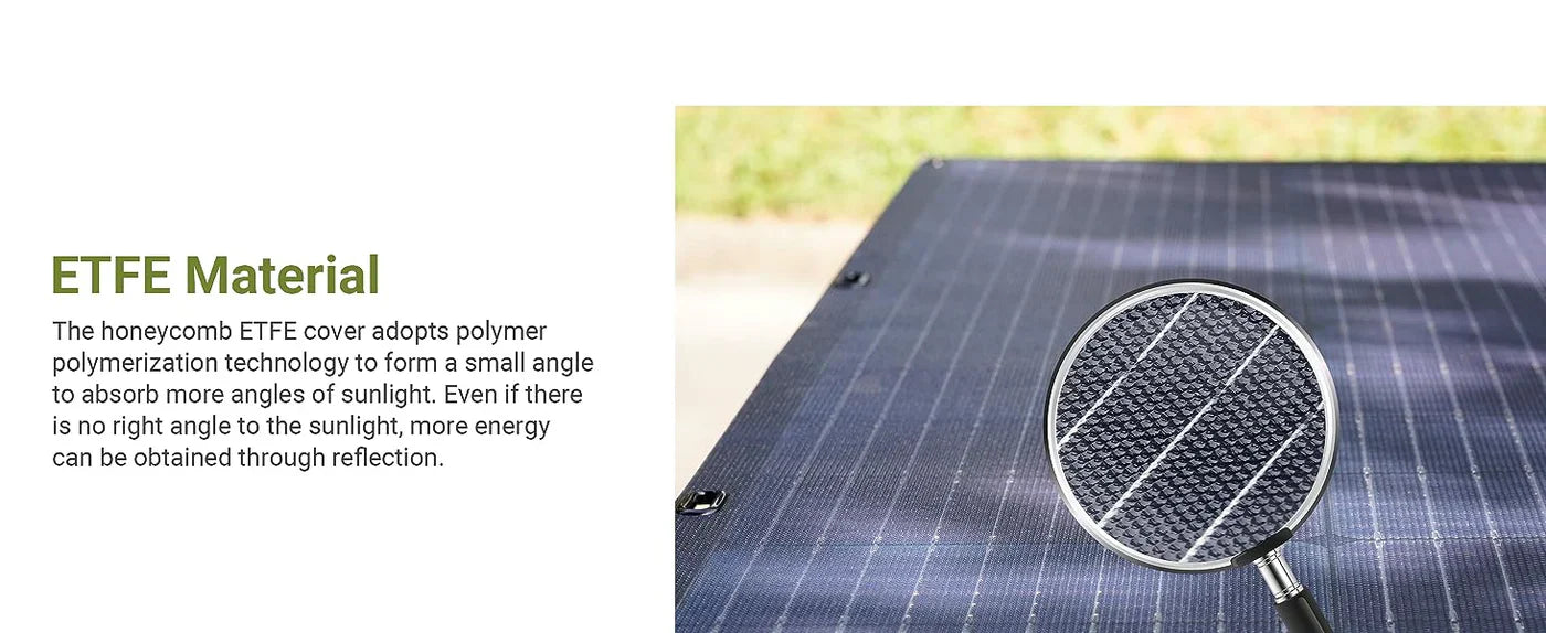 ALLPOWERS SF200 flexibele zonnepanelen zijn gemaakt van monokristallijne zonnecellen met een conversieratio van 23%-25%. Het oppervlak is voorzien van honingraat-ETFE, waarvan de ongelijkmatigheden refractie vormen om zonlicht uit verschillende hoeken te verzamelen. Gecombineerd met de Solar Connector-aansluiting met minimaal verlies, kunt u meer vermogen tegelijkertijd genereren. Uitstekende keuze voor campers, daken, caravans, aanhangers, boten, hutten, schuren, tenten, jachten.